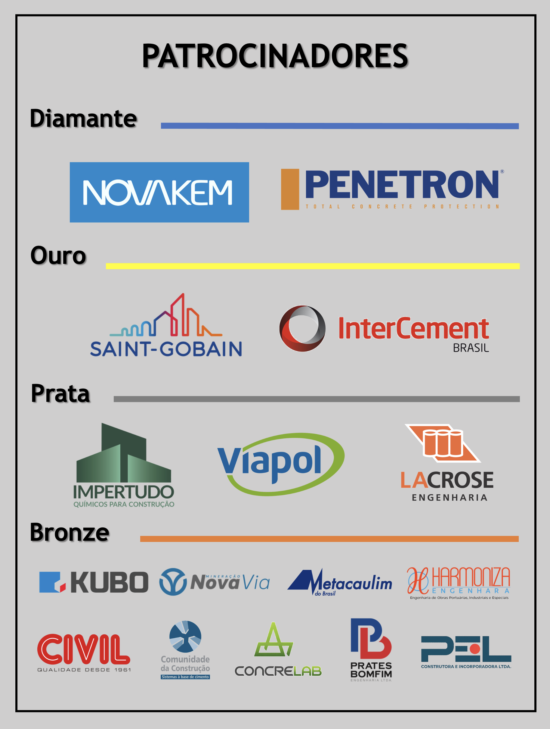 O evento é uma realização do Laboratório de Ensaios em Durabilidade dos Materiais (LEDMa/UFBA) e do Programa de Pós-Graduação em Engenharia Civil (PPEC/UFBA), contando com o apoio do Departamento de Ciência e Tecnologia dos Materiais da Escola Politécnica da Universidade Federal da Bahia (DCTM/EPUFBA), da Fundação Escola Politécnica (FEP/BA), do Conselho Regional de Engenharia e Agronomia da Bahia (CREA-BA), da Comunidade da Construção e da Associação Brasileira de Corrosão (ABRACO).